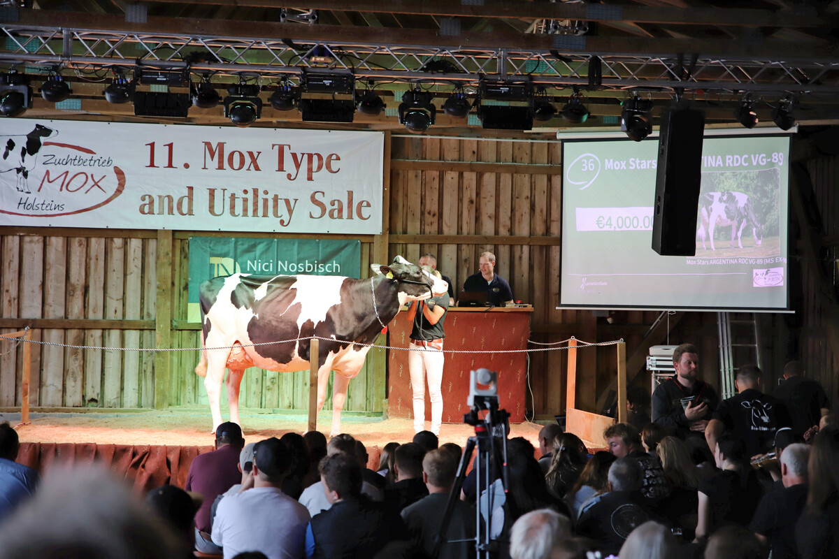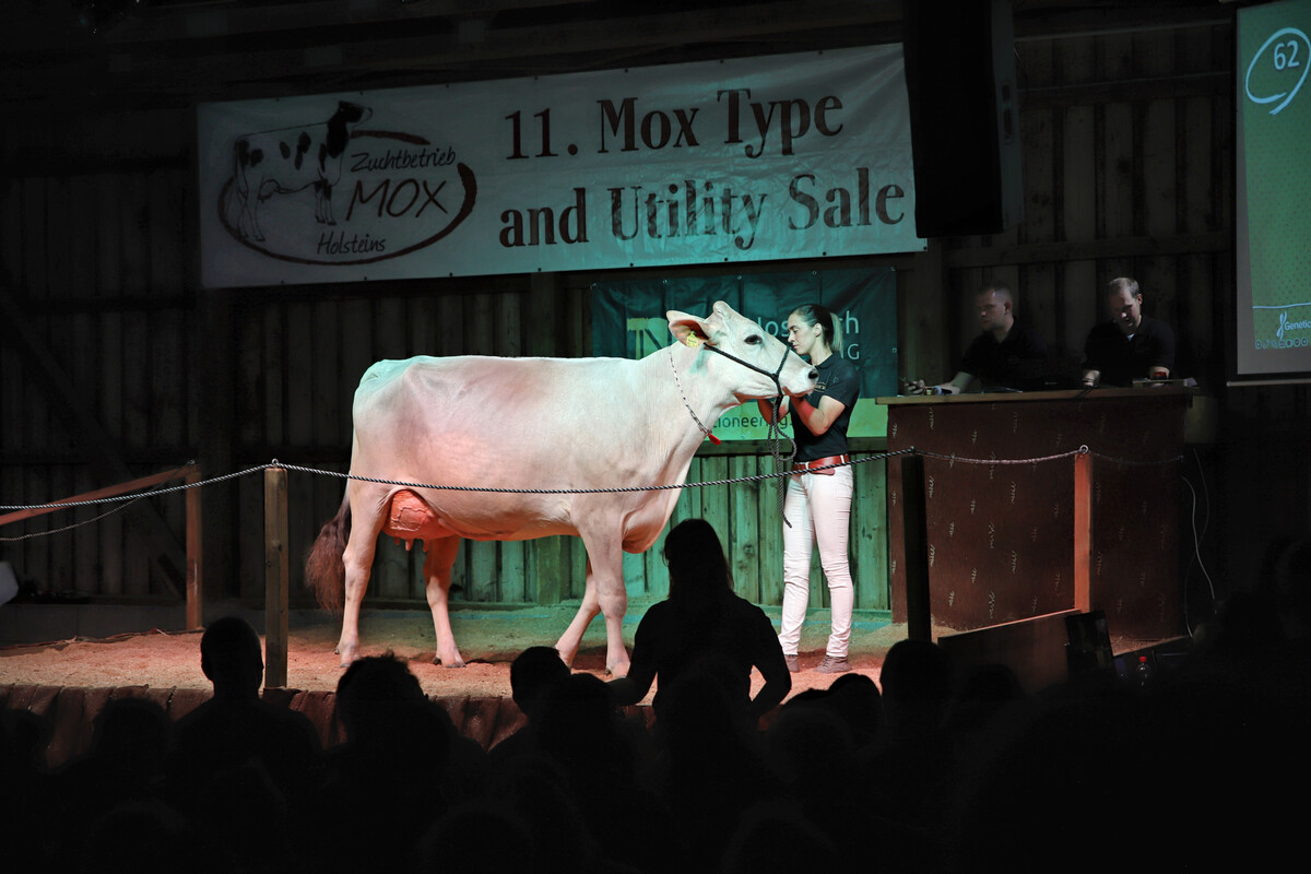 Bereits um die Mittagszeit konnten sich die Interessenten ein Bild von den bestens vorbereiteten Tieren machen. Zusätzlich konnten Zuchtbegeisterte aus vielen Ländern die Auktion live verfolgen und online mitbieten. Als Auktionator fungierte erneut der bekannte Nici Nosbisch. Pedigreeleser war auch diesmal Cord Hormann, ein Kenner der weltweiten Holsteinzucht. Erstmals waren über 100 Katalognummern im Auktionskatalog. Neben Tieren aus der Mox-Herde waren auch Tiere anderer nationaler und internationaler Züchter im Angebot.