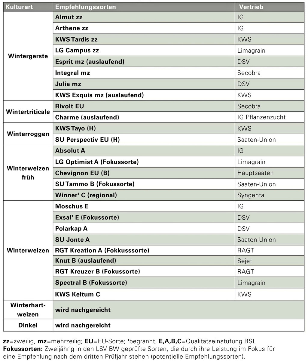 Die Empfehlungssorten für viele Winterungen stehen fest. Für Winterhartweizen und Dinkel werden die empfohlenen Sorten nachgereicht. Korrekturen gab es am 9. September bei den Weizensorten.