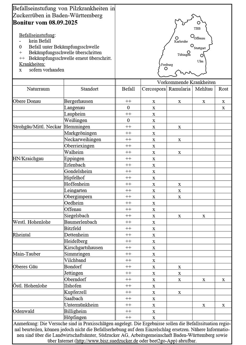 An dieser Stelle bedankt sich die Rübenabteilung Baden-Württemberg herzlich bei allen Boniteuren für die tatkräftige Unterstützung. In diesem Jahr galt neben den Blattkrankheiten bereits seit Mai besonderes Augenmerk dem Auftreten der Schilf-Glasflügelzikade. Ohne die Boniteure in den Regionen wäre eine intensive und flächendeckende Beobachtung der Rübenschläge und die entsprechende Beratung nicht möglich gewesen.