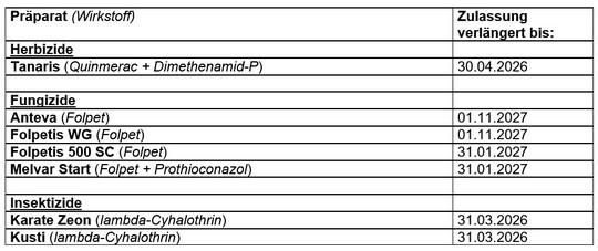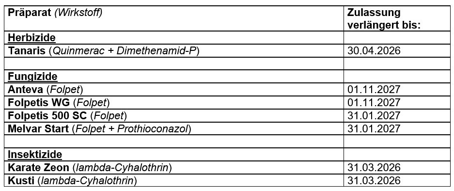 Das Bundesamt für Verbraucherschutz und Lebensmittelsicherheit hat die Zulassung von Pflanzenschutzmitteln, deren Zulassung durch Zeitablauf endete, verlängert.