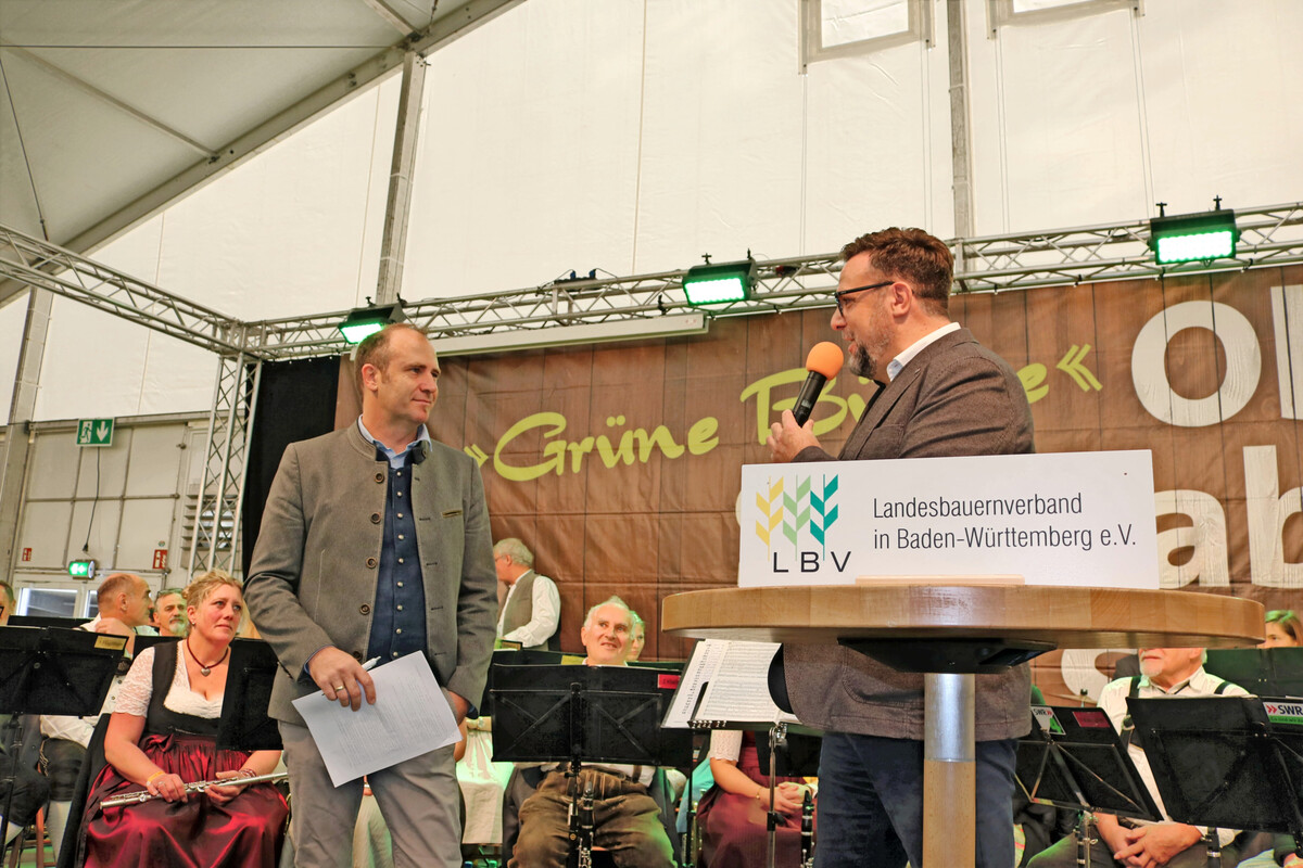 Die Bühnenaktion „Baumpflanz-Challenge“ der Landjugend Württemberg-Hohenzollern unter Leitung von Daniel Hirschmann kam bei den Zuhörern gut an. Beim inszenierten Klassentreffen berichteten die Schüler über ihre Erfahrungen bei der Berufswahl und erarbeiteten so ihre Forderungen an die Politik, wie zum Beispiel mehr Planbarkeit und Verlässlichkeit, Regulierungsmaßnahmen für die Biberpopulationen oder bei der Wiedervernässung der Moore. Ziel sei es, die Herausforderungen offen und positiv anzugehen und vorherige Schuldzuweisungen. Dazu müssen an dem Baum möglichst viele grüne Blätter nachwachsen und sich starke Wurzeln ausbilden. Zur Baumpflanz-Challenge nominiert wurde Agrarminister Peter Minister Hauk. „Nehmen Sie den Baum mit, ich hoffe, Sie haben vor dem MLR noch Platz zum Einpflanzen. Nehmen Sie die Blätter mit ins Büro und setzen Sie unsere Forderungen um,“ so Hirschmann.
