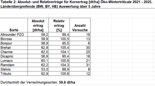 Im Rahmen der vom Landwirtschaftlichen Technologiezentrum (LTZ) Augustenberg durchgeführten ökologischen Landessortenversuche wird der Anbau von Wintertriticale zur Körnernutzung geprüft. Die Prüfung erfolgt an 2 Standorten, Crailsheim (Betreuung Demeter-Beratung) und Ochsenhausen (Betreuung LRA Biberach).