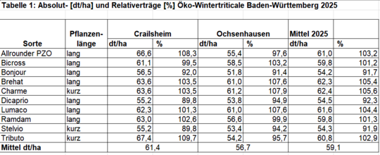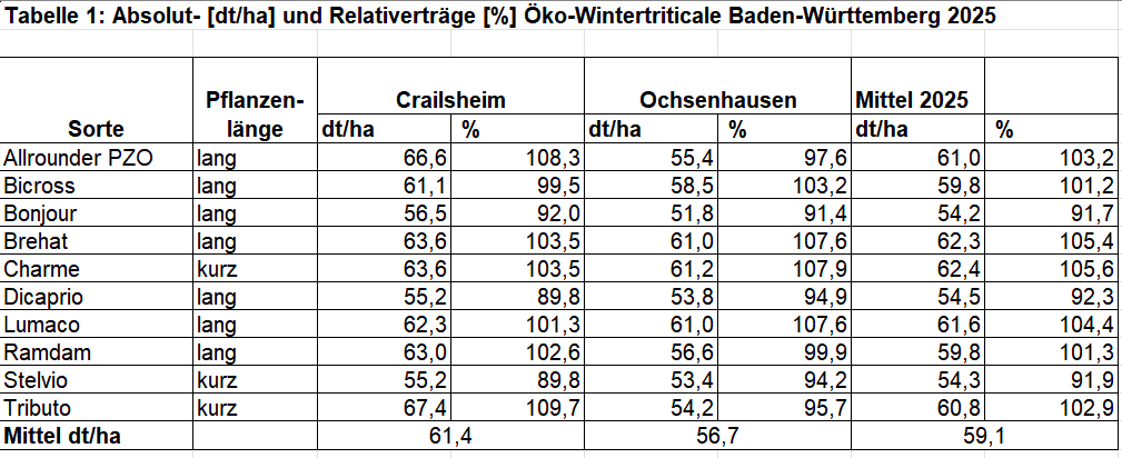 Die Frühjahrsentwicklung verlief unauffällig und die überwiegend trockene Witterung im Frühjahr hat die Triticale gut verkraftet. In Crailsheim führte die Hitze Ende Juni zu einer schnellen Abreife, so dass am 20. Juli 2025 geerntet wurde. In Ochsenhausen verzögerte sich die Ernte durch die nasskalte Phase von Ende Juli bis Anfang August. Somit konnte in Ochsenhausen erst am 8. August 2025 geerntet werden. Der viele Regen führte bei allen Sorten in Ochsenhausen zum Auswachsen der Körner am Halm.