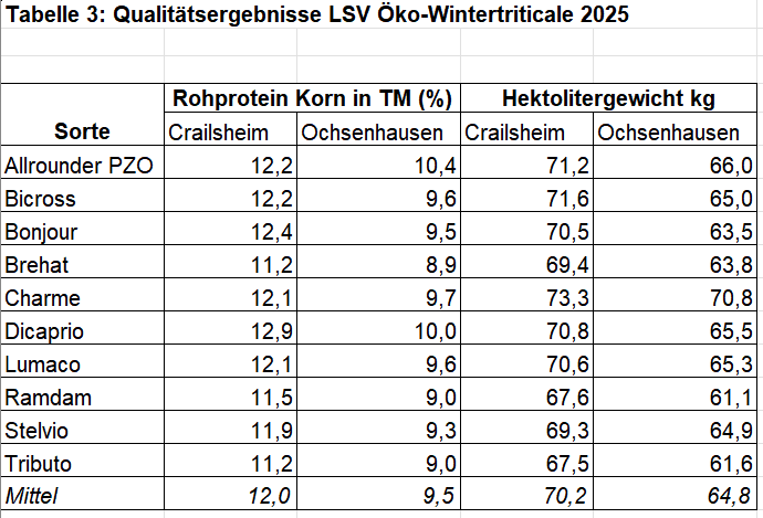 Die Qualitätsanalysen zeigten erfreuliche Ergebnisse mit guten Rohproteinwerten in der Trockenmasse mit durchschnittlich 12,0 % in Crailsheim, die in den zwei Vorjahren bei nur 9,8 % lagen. In Ochsenhausen wurden 9,5 % Rohprotein im Durchschnitt erreicht, die über den 8,4 und 8,9 % der Jahre 2023 und 2024 lagen. Die Hektolitergewichte lagen hingegen unter denen beider Vorjahre und erreichten 70,2 kg in Crailsheim und 64,8 kg in Ochsenhausen. Einzelwerte der einzelnen Sorten sind in Tabelle 3 aufgelistet.
