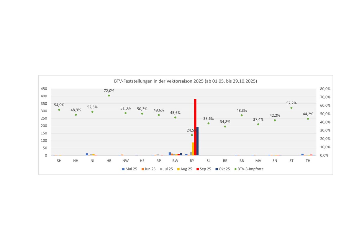 BTV-3 führte ab August 2024 zu einen bundesweiten Seuchenzeug. Aus diesem Grund konzentrierten sich die Impfungen in den Jahren 2024 und 2025 auf den Serotyp 3. Durch die hohe BTV-3-Impfrate konnte ein erneuter Seuchenzug im Jahr 2025 verhindert werden. Allerdings verzeichnet der südliche Teil Bayerns derzeit einen starken Anstieg an neuen BTV-3-Fällen, wie in Abbildung 2 zu erkennen ist. Das hängt damit zusammen, dass die Immunitätslage (Abwehrfähigkeit) einer Tierpopulation durch die Impfrate und den Durchseuchungsgrad bestimmt wird, das heißt eine Neuinfektion oder das Wiederaufflackern von Infektionen entstehen da, wo eine geringe Durchseuchung und eine niedrige Impfrate bestehen. Eine Durchseuchung ist immer mit viel Tierleid verbunden. Die Impfung gegen BT bietet dagegen einen Rundumschutz vor Krankheitssymptomen, einer Seuchenausbreitung und Handelsbeschränkungen.
