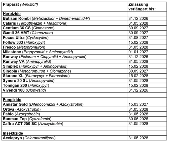 Das Bundesamt für Verbraucherschutz und Lebensmittelsicherheit hat die Zulassung von Pflanzenschutzmitteln, deren Zulassung durch Zeitablauf endete, verlängert. Die Zulassungsverlängerungen werden bis zur endgültigen Entscheidung über eine erneute Zulassung erteilt.