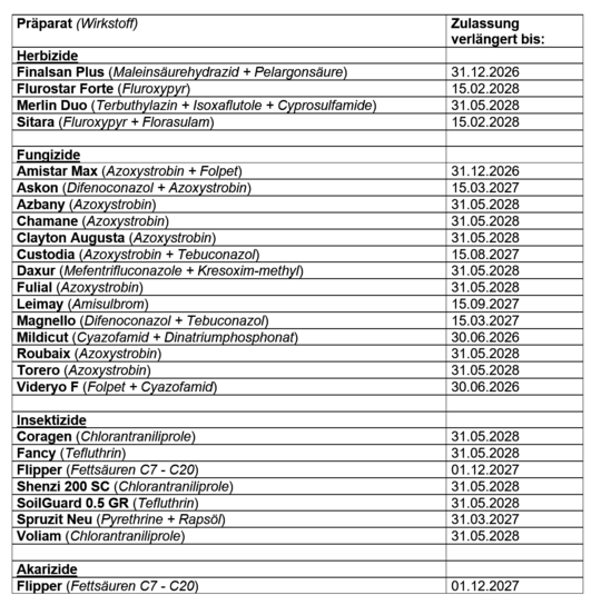 Das Bundesamt für Verbraucherschutz und Lebensmittelsicherheit hat die Zulassung von Pflanzenschutzmitteln, deren Zulassung durch Zeitablauf endete, verlängert. Die Zulassungsverlängerungen werden bis zur endgültigen Entscheidung über eine erneute Zulassung erteilt.