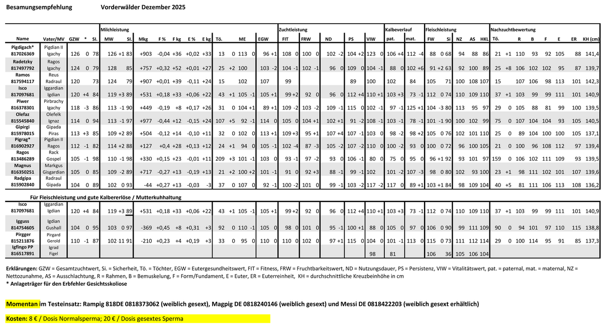 Noch mehr Informationen über die Dezember-Zuchtwerte der Vorderwälder- und Hinterwälder-Vererber finden sich sich unter: https://www.rind bw.de/bullen/waeldervieh/vorderwaelder/bullenempfehlung-31.html