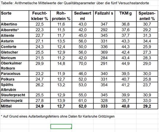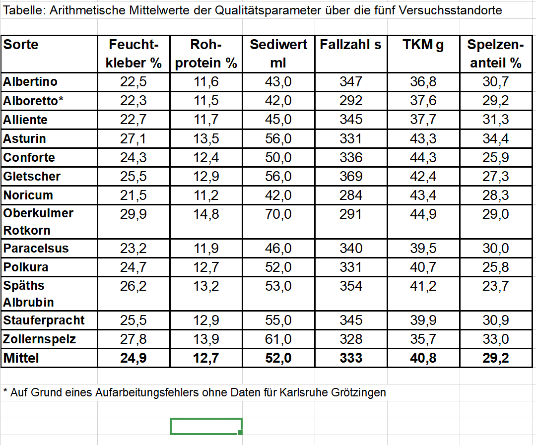 Die Qualitäten hingegen liegen leicht unter denen des Vorjahres 2024. So wurde im Durchschnitt über alle Sorten und Standorte ein Feuchtkleber von 24,9 Prozent erreicht. Die Feuchtklebergehalte reichten von durchschnittlich 21,7 Prozent (Ochsenhausen) über 24,3 Prozent (Hohenheim) und 24,9 Prozent (Maßhalderbuch) bis zu 26,7 Prozent (Karlsruhe-Grötzingen) und 26,9 Prozent (Crailsheim). In Bezug auf die Sorten lagen Noricum, Alboretto und Albertino am unteren Ende des Feuchtklebergehalts (21,5, 22,3 und 22,5 Prozent). Die höchsten Feuchtklebergehalte erreichten Oberkulmer Rotkorn (29,9 Prozent) gefolgt von Zollernspelz (27,8 Prozent) und Asturin (27,1 Prozent).
