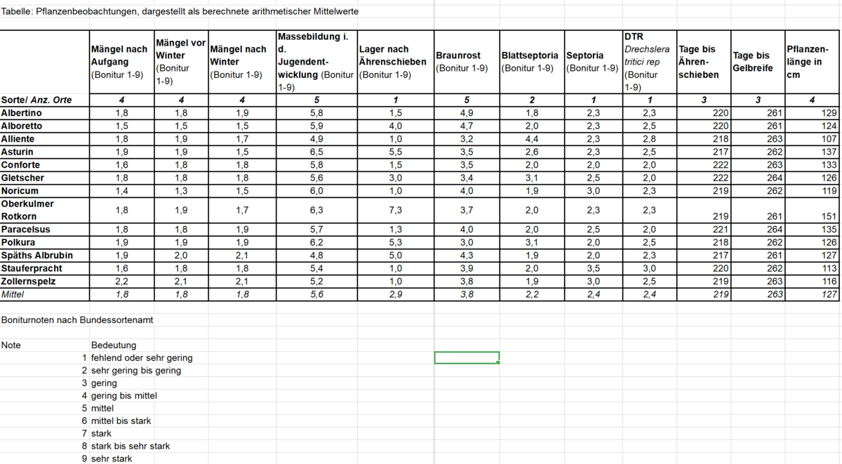 Albertino: Zulassung 2019. Gute Gelbrostresistenz, in diesem Jahr die Sorte mit höchstem Braunrostbefall (4,9). Mittellang, gut standfest. 2025 genau den durchschnittlichen Ertrag (rel. 100) erreicht. Beim Feuchtklebergehalt und Tausendkerngewicht (TKM) unter dem Versuchsmittel. Züchter: Alter-Seeds, Pflanzenzucht und Versuchswesen.