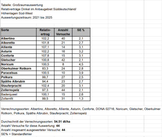 Erträge und Qualitätsmerkmale der Dinkelsorten