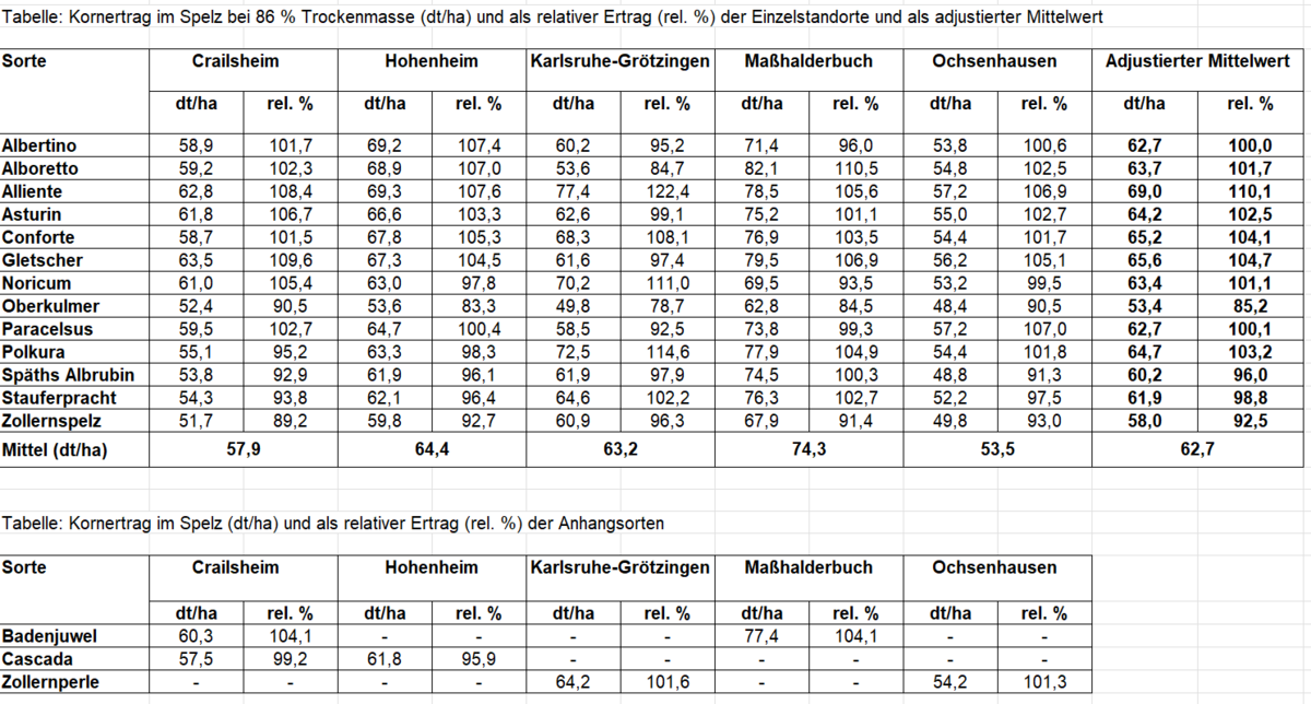 Die Sortenprüfungen im ökologischen Landbau zu Dinkel finden in Baden-Württemberg an fünf Standorten statt. Diese sind in Karlsruhe-Grötzingen (Betreuung LTZ Augustenberg), Stuttgart-Hohenheim (Betreuung Universität Hohenheim), Crailsheim (Betreuung Demeter-Beratung), Maßhalderbuch (Betreuung Landratsamt Reutlingen) und in Ochsenhausen (Betreuung Landratsamt Biberach). In diesem Jahr waren alle fünf Standorte wertbar. An allen Standorten wurden 13 Sorten geprüft, zwei davon kamen neu in die Prüfung.