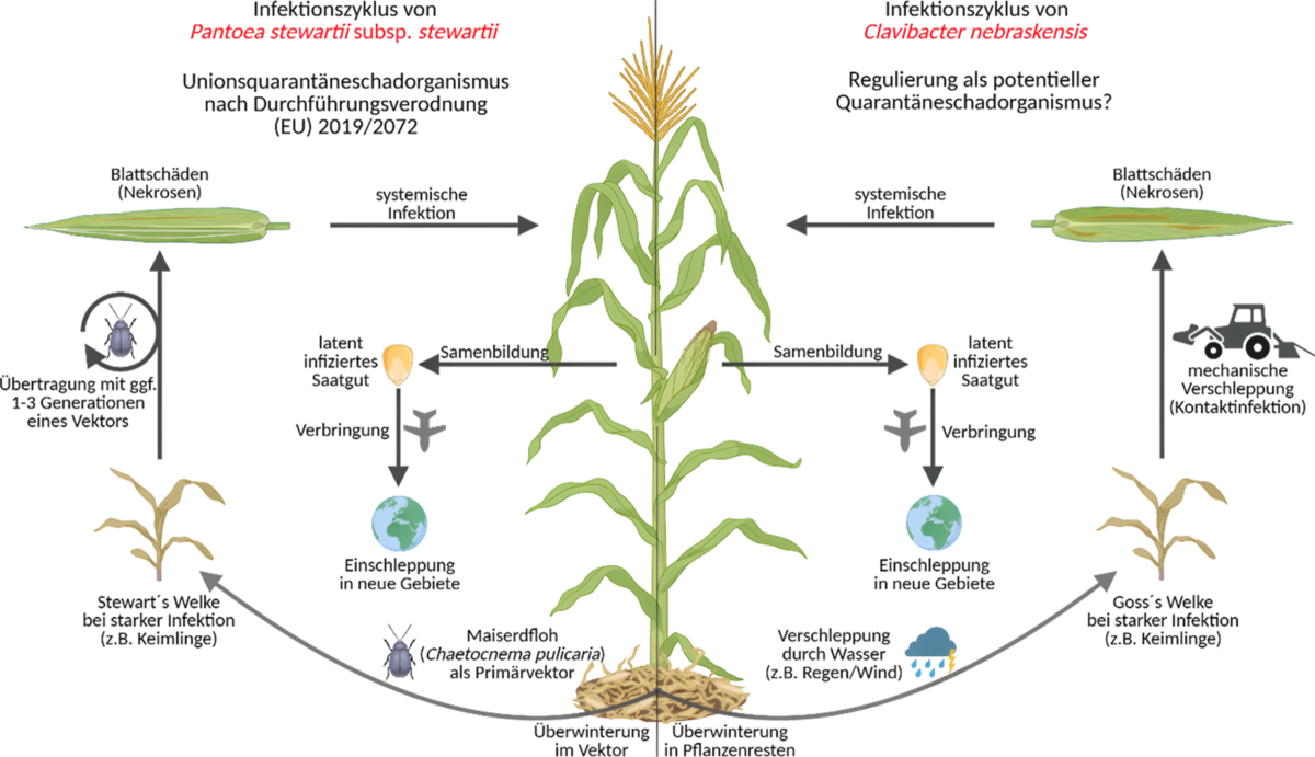 Dass Pantoea stewartii subspecies stewartii in Saatgut aus Italien vorkommt, sollte trotz dortiger Tilgungsmaßnahmen nicht ausgeschlossen werden. In den betroffenen Regionen wurde Saatgut produziert und das Bakterium ist über mehrere Jahre immer wieder vereinzelt nachgewiesen worden. Ein Auftreten von Clavibacter nebraskensis ist in Europa dagegen bisher nicht bekannt.