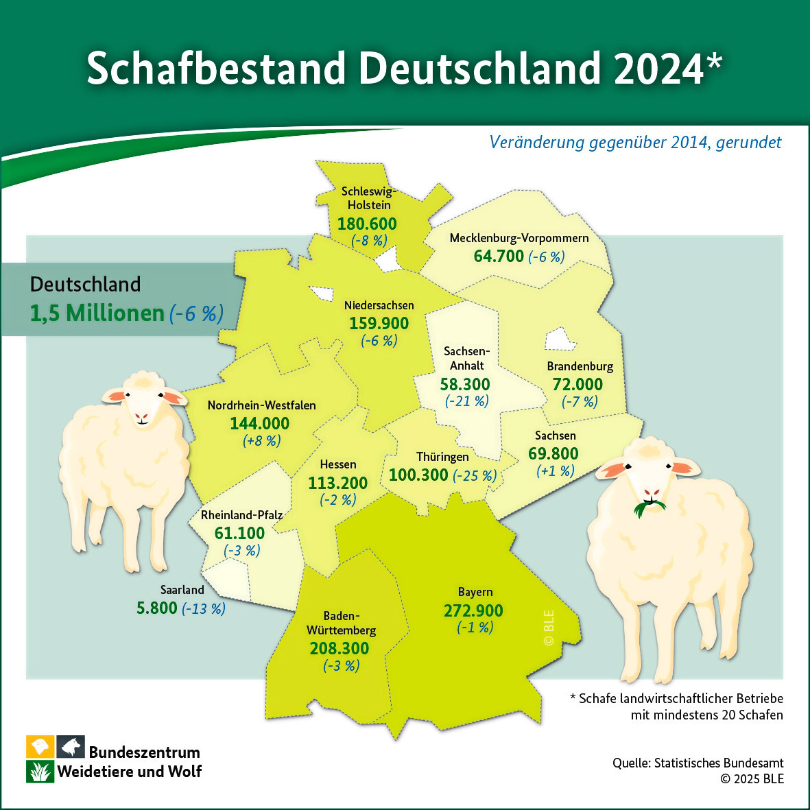 In Deutschland wurden 2024 rund 1,5 Mio. Schafe auf 9670 landwirtschaftlichen Betrieben gehalten. Der heimische Schafbestand ist damit innerhalb der vergangenen zehn Jahre um fast sechs Prozent oder knapp 90.000 Tiere geschrumpft. Mit Ausnahme der Bundesländer Sachsen und Nordrhein-Westfalen reduzierten sich die Schafzahlen in allen Bundesländern. Parallel ging die Anzahl der Betriebe in diesem Zeitraum um gut zwei Prozent zurück.