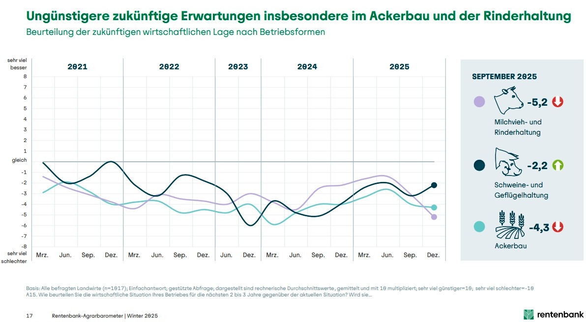 Der Ausblick auf die kommenden zwei bis drei Jahre bleibt verhalten: Die Bewertung der künftigen wirtschaftlichen Lage sank von -3,7 auf -4,6 Punkte. Hauptgrund sind die erwarteten weiter steigenden Betriebsmittelpreise, hohe bürokratische Auflagen und die kritische Einschätzung der Agrarpolitik. Fast die Hälfte (48 Prozent) der Befragten sieht ihre Zukunftsaussichten inzwischen als schlechter oder sehr viel schlechter an (vorherige Umfrage: 38 Prozent).