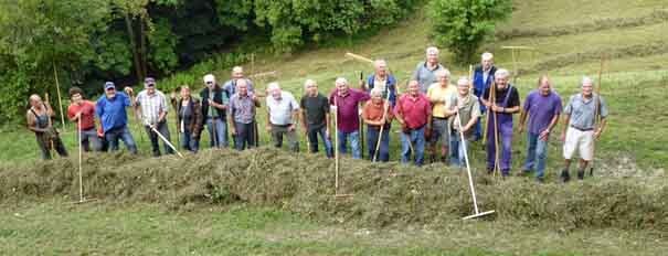 „Ohne uns, gäbe es diese Wiese längst nicht mehr“, sagt Dietmar Bez aus Glems. Er ist Vorsitzender der Ortsgruppe Metzingen des Schwäbischen Albvereins. Die Ortsgruppe fühlt sich seit 40 Jahren dafür verantwortlich, die Wiese in steiler Hanglage zu erhalten. Das Gehen auf der Wiese ist schon schwierig, die Bewirtschaftung umso mehr, weshalb viel ehrenamtlicher Handeinsatz der Mitglieder gefordert ist. Doch der lohnt sich! Seltene Arten wie zum Beispiel die Fliegenragwurz und das Kreuzblümchen blühen in diesem artenreichen Magerrasen. Die Fläche wird ein Mal im Jahr, immer im Herbst, gemäht und das Mähgut abtransportiert, um die Wiese weiter auszuhagern. Um einer Verbuschung entgegen zu wirken müssen die aufkommenden Schlehen- und Eschentriebe beseitigt werden. Ab diesem Herbst wird auch die angrenzende Fläche mitgepflegt, um ein weiteres Vordringen der Waldränder und von Jakobskreuzkraut zu verhindern.
