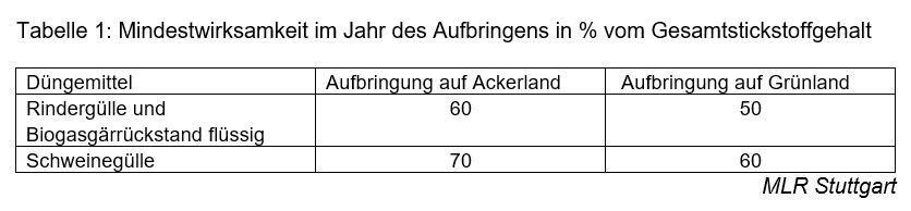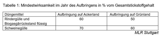 Tabelle 1: Mindestwirksamkeit im Jahr des Aufbringens in % vom Gesamtstickstoffgehalt