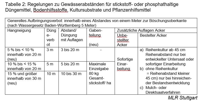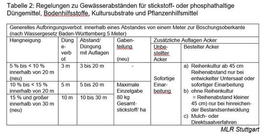 Die Abstände entlang von Gewässern, die nicht oder nur mit Auflagen gedüngt werden dürfen, wurden in Abhängigkeit von der Hangneigung erweitert. Neben dem generellen Mindestabstand gibt es jetzt 3 Hangneigungsklassen gemessen ab der Böschungsoberkante (5 bis 10 Prozent, 10 bis 15 Prozent und größer als 15 Prozent Neigung).