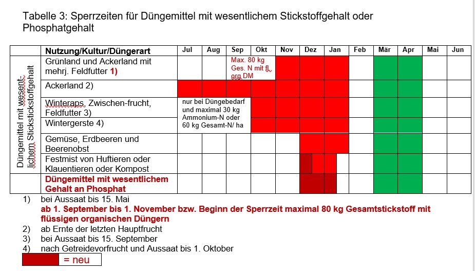 Die Sperrzeiten für Festmist von Huf- und Klauentieren oder Kompost wurden um zwei Wochen verlängert und vorgezogen, diese ist ab 1. Dezember bis zum Ablauf des 15. Januar. Für den gleichen Zeitraum wurde ein neuer Sperrzeitraum für Düngemittel mit einem wesentlichen Gehalt an Phosphat eingeführt (mehr als 0,5 Prozent Phosphat in der TM). Die Düngung auf Grünland und Ackerland mit mehrjährigem Feldfutter (Aussaat bis 15. Mai) mit flüssigen organischen Düngern im Herbst wird auf 80 kg Gesamtstickstoff/ha begrenzt. Diese Regelungen greifen bereits ab Herbst 2020. Einen Überblick über die bisherigen und neuen Sperrzeiten gibt Tabelle 3.