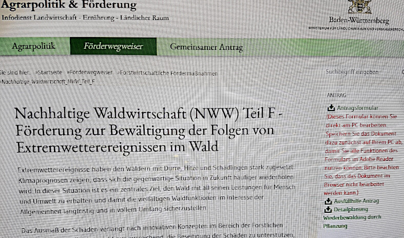 Antragsunterlagen und weitere Informationen gibt es unter https://foerderung.landwirtschaft-bw.de/pb/,Lde/Startseite/Foerderwegweiser/Nachhaltige_Waldwirtschaft_NWW_Teil_F