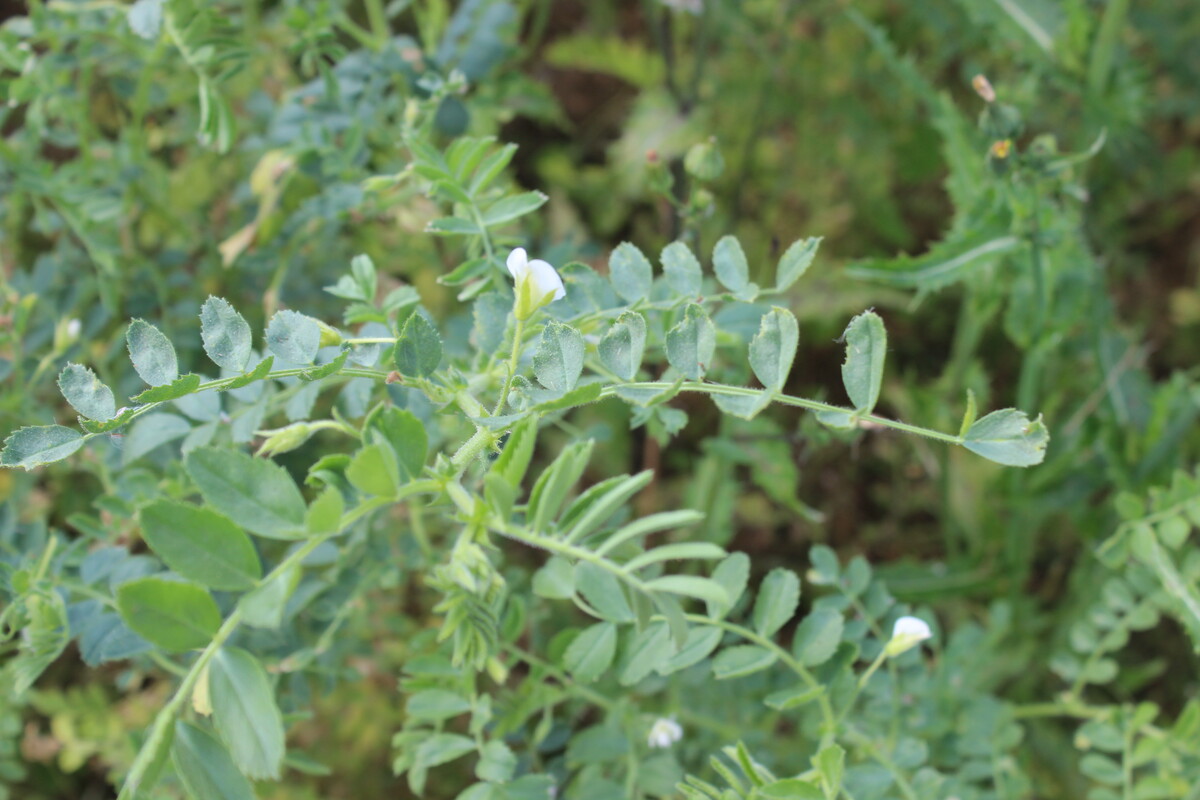 Im Bestand Ende Juli konnte man erkennen, dass die Pflanzen aller angebauten Sorten nur wenige Hülsen trugen. Denn die Anbaubedingungen für die Kichererbsen waren im Juni und Juli 2021 nicht optimal. Fallen im Jahresdurchschnitt etwa 630 mm Niederschlag, so waren die Monate Juni und Juli für die Region deutlich zu nass und zu kühl. Die durchschnittlichen Tagestemperaturen im Juni lagen oftmals unter 15°C, was zu einer reduzierten Blütenbildung bzw. zu einem reduzierten Hülsenansatz führte. Außerdem wurden durch die nassen Bedingungen Pilzkrankheiten wie die Brennfleckenkrankheit (Ascochyta) begünstigt. Diese Anzeichen von Kranheiten sind auf dem Betrieb Böres im Kichererbsenanbau aber neu.