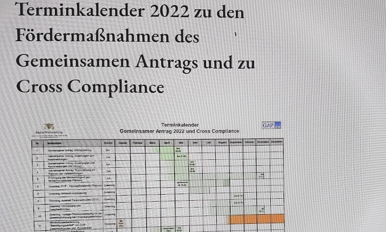 Das Ministerium für Ländlichen Raum und Verbraucherschutz Baden-Württemberg (MLR) informiert in einem Terminkalender zu den Fördermaßnahmen des Gemeinsamen Antrags und zu Cross Compliance.