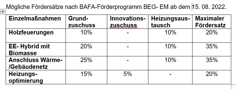 Die bisher über die BAFA abgewickelte Förderungen von Holzfeuerungen wird kurzfristig deutlich reduziert. Wer noch von den komfortablen Fördersätzen profitieren will, muss bis zum 14. August 2022 handeln.