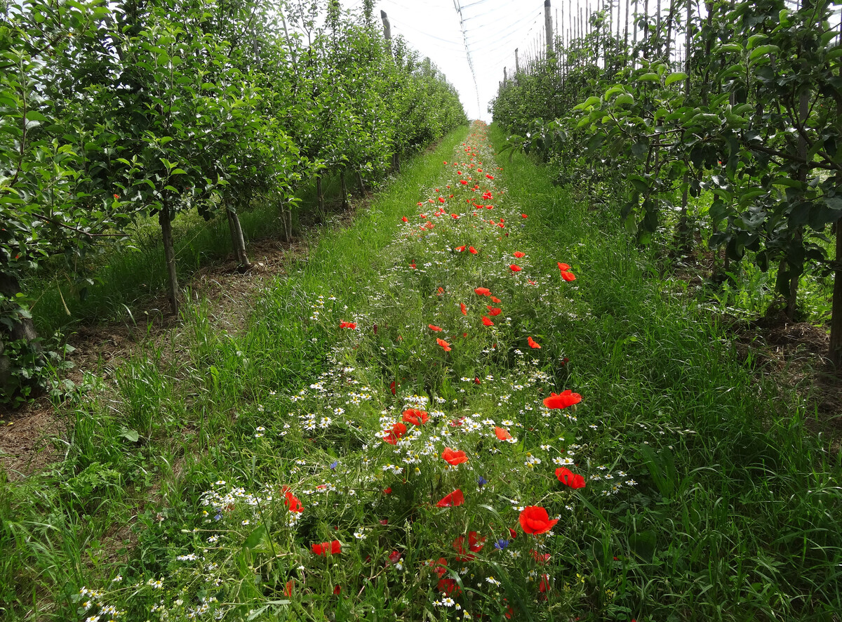 Ein weiteres Problem, das hohe wirtschaftliche Schäden verursachen kann, sind saugende Insekten wie die Blutlaus oder bestimmte Arten fruchtschädigender Baumwanzen. Über verschiedene Maßnahmen im Vegetationsmanagement sollen ihre natürlichen Gegenspieler, wie die Larven von Marienkäfern oder Schwebfliegen, gefördert werden. Dafür werden speziell konzipierte Blühstreifen für die Fahrgassen in den Obstplantagen entwickelt.