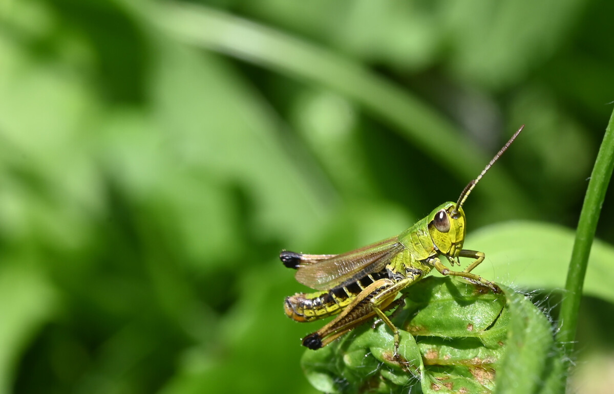 Der Gemeine Grashüpfer hat seinen Namen verdient. Weil er „gemein“ im Sinne von „gewöhnlich“ oder „häufig“ ist. Bei einem Gang durch die Wiese hüpfen diese Kurzfühlerschrecken in Scharen davon. Und wenn man sie nicht sieht, dann hört man sie. Gerade bei warmem Wetter erklingt unablässig ihr schnarrender Gesang. Er wird dadurch erzeugt, dass ein Sägekamm an der Innenseite der Hinterschenkel an der Kante der Flügeldecke entlanggeführt wird. Es singen nur die Männchen, um die Weibchen anzulocken oder Rivalen auf Abstand zu halten. In der Färbung können die Tiere übrigens variabel sein. Es gibt grüne und braune, manchmal auch rötlich gefärbte Exemplare. Das hängt vom Lebensraum ab. Die Grashüpfer können sich farblich auf ihn einstellen, allerdings nicht aktiv wie zum Beispiel ein Chamäleon, sondern von Häutung zu Häutung.
