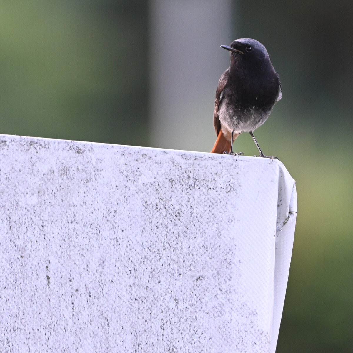 Auffällig ist der namensgebende rote Schwanz, das ständige, scheinbar nervöse Hin- und Her-Wippen und Knicksen sowie der knarzende Gesang. Das Männchen ist, wie auf dem Bild zu sehen, überwiegend rußschwarz, das Weibchen dagegen hellbraun. Den roten Schwanz haben beide Geschlechter. Der zarte Schnabel weist die Art als Insektenfresser aus. Als solcher ist der Hausrotschwanz ein Zugvogel, allerdings zieht es ihn im Winter von uns aus nur ins Mittelmeergebiet. Er „reist“ spät ab, man kann ihn jetzt immer noch sehen und er ist auch früh wieder da, teilweise schon im Januar oder Februar. Dann lässt er auch schon bald von den Dachfirsten seinen typischen, wenig melodiösen Gesang hören, der ein wenig an den rauschenden Sendersuchlauf eines Radios erinnert. Der NABU nennt ihn einen „Singenden Morgenwecker“. Als solcher scheint er nicht zu nerven. Denn er wurde gerade bei einer öffentlichen Wahl zum „Vogel des Jahres 2025“ gewählt.