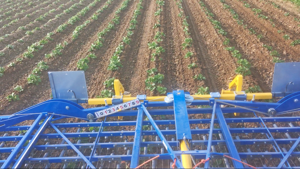 Der Landwirt stellt bei der Herbizidbehandlung in Kartoffeln zwei Varianten vor. In der Variante „Minus 20 % Herbizid“ herrschen für das Bodenherbizid ideale Voraussetzungen, wenn es nach der Ausbringung öfters regnet. Als Ergebnis steht fast kein Unkraut im Kartoffelbestand. In der Variante „Ohne Herbizid mit Hacke“ wirken sich die unterschiedlichen Wetter- und Bodenbedingungen sehr stark aus. Mal ist es zum Striegeln zu feucht, mal der Boden in der oberen Schicht zu hart und nicht schüttfähig, mal sind die Unkräuter für die Maschinenhacke zu groß, sodass der Landwirte die Hacke selbst in die Hand nehmen muss – mit entsprechendem Zeitaufwand. Mit dem Aufhäufeln macht Escher bisher stets gute Erfahrungen. Je nach Witterungsverlauf und Bodenstruktur steigt der Unkrautdruck etwa zu Sommerbeginn, zum Beispiel durch Weißen Gänsefuß („Melde“) oder Kluten erschweren die Rodung. Als Ergebnis gab es seit 2021 stets mehr grüne Kartoffeln als bei der Variante „Minus 20 % Herbizid“.