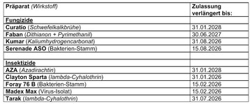 Das Bundesamt für Verbraucherschutz und Lebensmittelsicherheit hat die Zulassung von Pflanzenschutzmitteln, deren Zulassung durch Zeitablauf endete, verlängert.