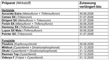 Das Bundesamt für Verbraucherschutz und Lebensmittelsicherheit (BVL) hat die Zulassung von Pflanzenschutzmitteln, deren Zulassung durch Zeitablauf endete, verlängert. Die Zulassungsverlängerungen werden bis zur endgültigen Entscheidung über eine erneute Zulassung erteilt.