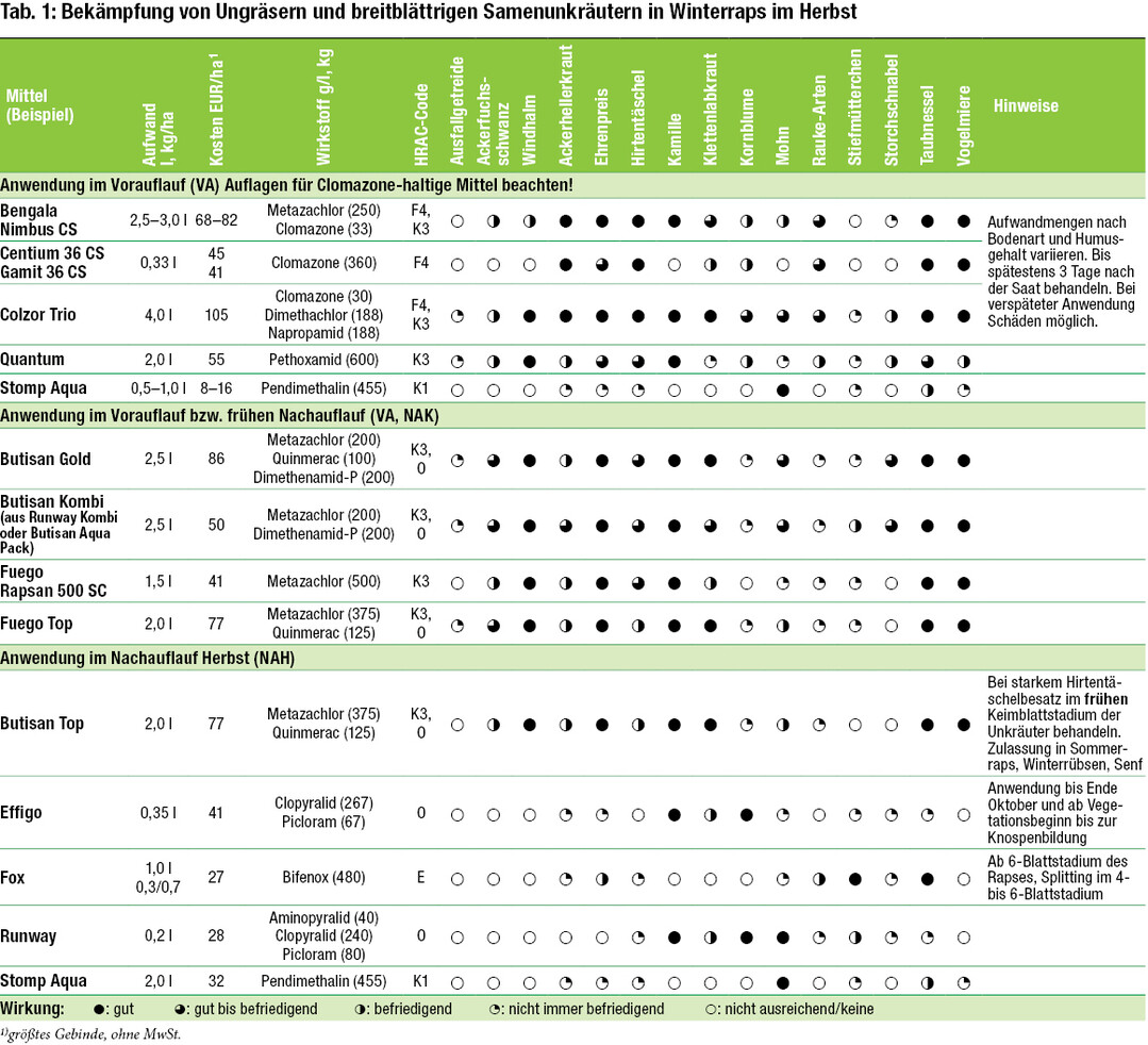 Welches Mittel gegen welches Unkraut? Je nach Art der Verunkrautung hilft ein anderes Mittel oder eine andere Kombination der Wirkstoffe. Kerstin Hüsgen vom Landwirtschaftlichen Technologiezentrum Augustenberg hat die amtlichen Herbizid-Empfehlungen für den Winterraps zusammengestellt.