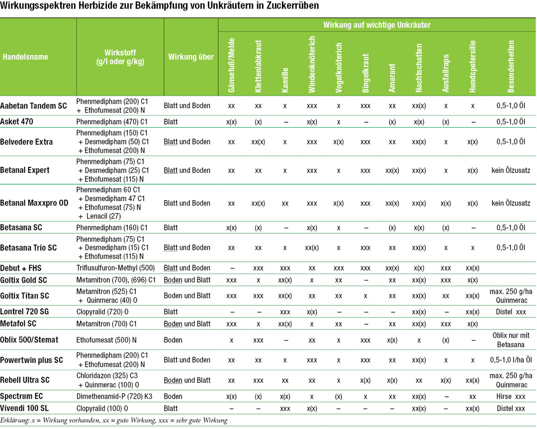 Zuckerrüben können infolge ihrer langsamen Jugendentwicklung schnell von Konkurrenzpflanzen – Unkräutern und Ungräsern – unterdrückt werden. Deshalb ist eine frühzeitige und effiziente Unkrautbekämpfung für eine ungestörte Bestandsentwicklung wichtig. Der Beitrag gibt einen Überblick über die zugelassenen Wirkstoffe, die übers Blatt oder über den Boden wirken.