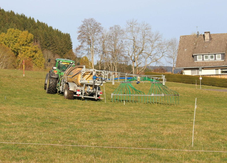 - Gülleausbringung: Wie lässt sich die im Herbst ausgebrachte Gülle im Vergleich zur Ausbringung im Frühjahr am besten verwerten? Problem: Deutsches Weidelgras, das auf eine Herbstgülledüngung in Folge seines auch bei niedrigen Temperaturen noch vorhandenen Wachstums sehr gut anspricht, ist in benachteiligten Gebieten meist nur in geringem Umfang vorhanden. Im Herbst 2016 wurde auf 15 Standorten der Projektbetriebe die Gülle des jeweiligen Betriebes ausgebracht. Anschließend wurde im Frühjahr 2017 erneut gegüllt. Dem Versuchsplan entsprechend haben einzelne Teilbereiche nur eine Herbstgüllegabe bekommen, auf anderen wurde eine Herbst- und Frühjahrgülle ausgebracht und auf wieder anderen wurde lediglich im Frühjahr Gülle ausgebracht. Die Aufwandsmengen wurden variiert. Pro Versuchsstandort gibt es sechs Varianten. Jetzt im Frühjahr werden die Ertragsschnite ausgewertet.