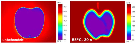 Am ATB wurde die Wirkung einer kurzen Heißwasserbehandlung auf die mikrobielle Belastung sowie auf die innere und äußere Qualität der Früchte untersucht. „Die wertvollen Inhaltsstoffe in der Schale sollen durch die Behandlung keinen Schaden nehmen“, so ATB-Wissenschaftler Dr. Werner Herppich. „Mit den Methoden der Chlorophyllfluoreszenzanalyse und Thermografie sowie mit mikrobiologischen und chemischen Analysen konnten wir nachweisen, dass die Fruchteigenschaften selbst bei relativ empfindlichen Sorten wie Braeburn durch eine Kurzzeitbehandlung bei 55 °C nicht beeinträchtigt wurden. Dagegen wurden Bakterien und die Gefahr von Kreuzkontaminationen durch die Behandlung umfassend reduziert.“ Das Verfahren kommt ohne chemische Zusätze aus und eignet sich damit auch für Bio-Fresh-Cut-Produkte.