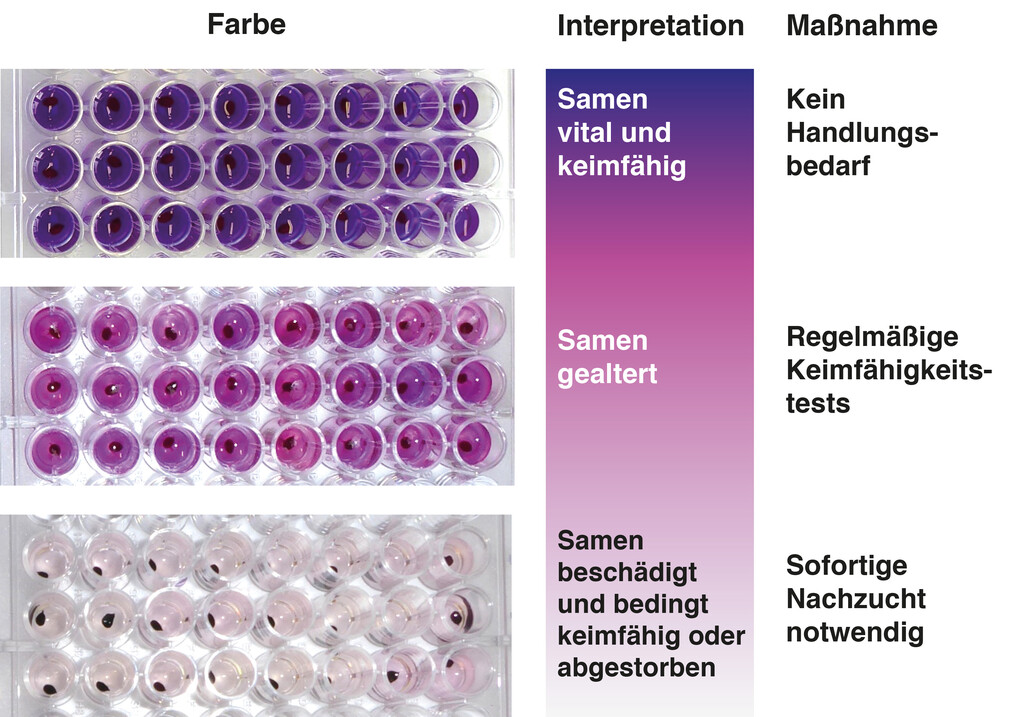 Eine blaue Testflüssigkeit zeigt voll vitale und keimfähige Samen an, eine pinkfarbene bereits gealterte Samen, während eine farblose Lösung beschädigte und nur bedingt keimfähige bis abgestorbene Samen anzeigt. Der Farbumschlag beruht auf einer natürlichen Freisetzung von organischen Substanzen aus alternden Samen. Keimfähige Samen werden durch den Test nicht geschädigt und können später erneut getestet werden.