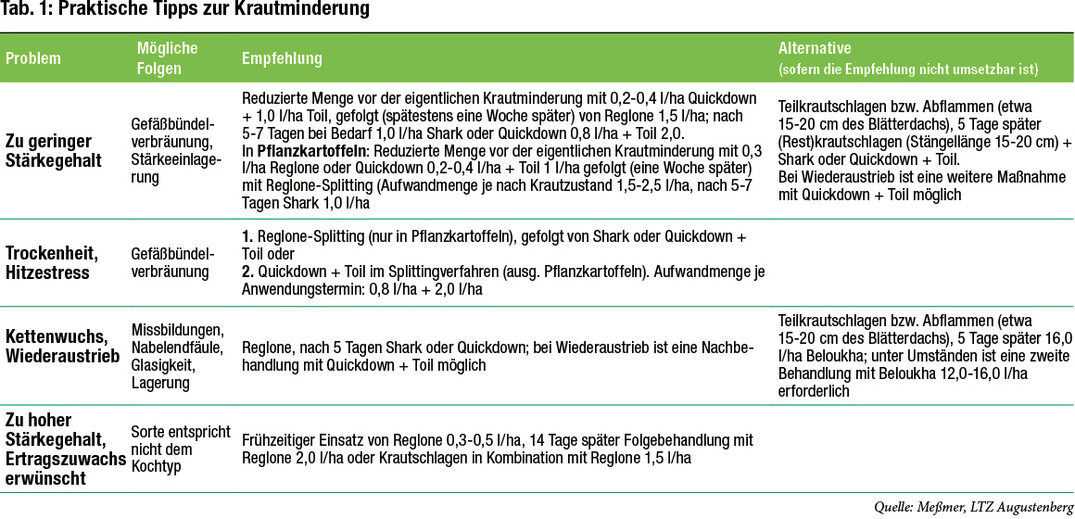 Ein zu geringer Stärkegehalt zum Zeitpunkt der Krautminderung kann zur Gefäßbündelverbräunung und unerwünschter Stärkeeinlagerung führen. Hier empfiehlt Meßmer, vor der eigentlichen Krautminderung mit reduzierten Mengen Quickdown (0,2-0,4 l/ha) und Toil (1,0 l/ha) und im Abstand von maximal einer Woche mit Reglone (1,5 l/ha) zu behandeln. Bei Bedarf kann nach weiteren 5 bis 7 Tagen 1,0 l/ha Shark oder Quickdown 0,8 l/ha und Toil 2,0 angewendet werden.