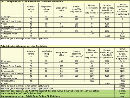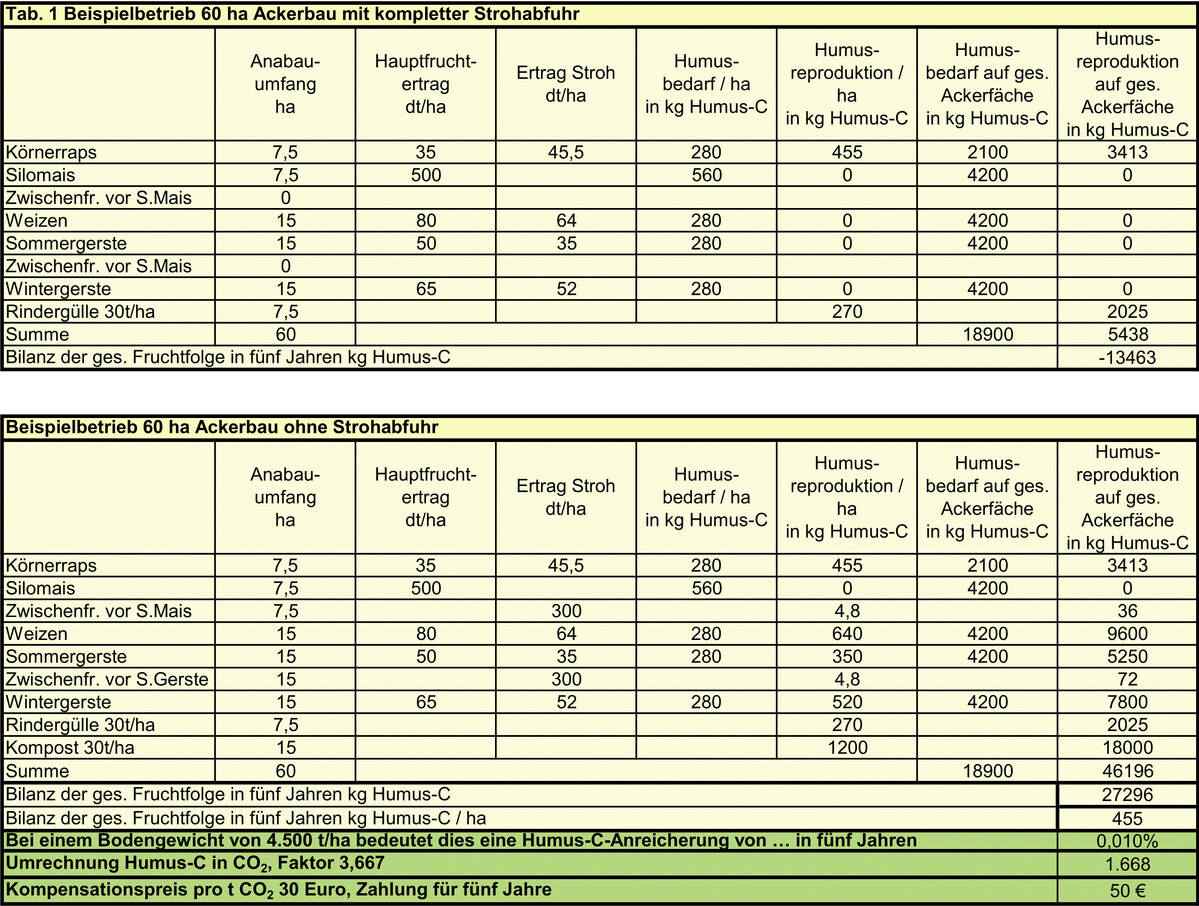 Dennoch zeigt das Beispiel eines Betriebes (Tab. 1) mit 60 ha Ackerbau und fünf Fruchtfolgegliedern, der alle Vorgaben der Anbaudiversifizierung erfüllt, dass der Verkauf des kompletten Getreidestrohs zu einer negativen Kohlenstoffbilanz führt. Ein Getreidebestand hat unabhängig von der Getreideart und dem Ertrag einen Humusbedarf von 280 kg Humus-C pro ha. Im Gegenzug liefert das Stroh eine Reproduktion von 100 kg Humus-C je Tonne Stroh. Zum Silomais werden in diesem Beispiel 30 t/ha Rindergülle mit einem TM-Gehalt von 7 Prozent und einem Humus-C-Äquivalent von 9 kg pro Tonne Substrat gedüngt. Zur Sommergerste bringt der Betreib 30 t/ha Kompost aus, mit einem Humus-C-Äquivalent von 40 kg pro Tonne Substrat. Zusätzlich belässt dieser Betrieb das komplette Getreidestroh auf der Fläche und baut vor der Aussaat der Sommerungen Zwischenfrüchte an.