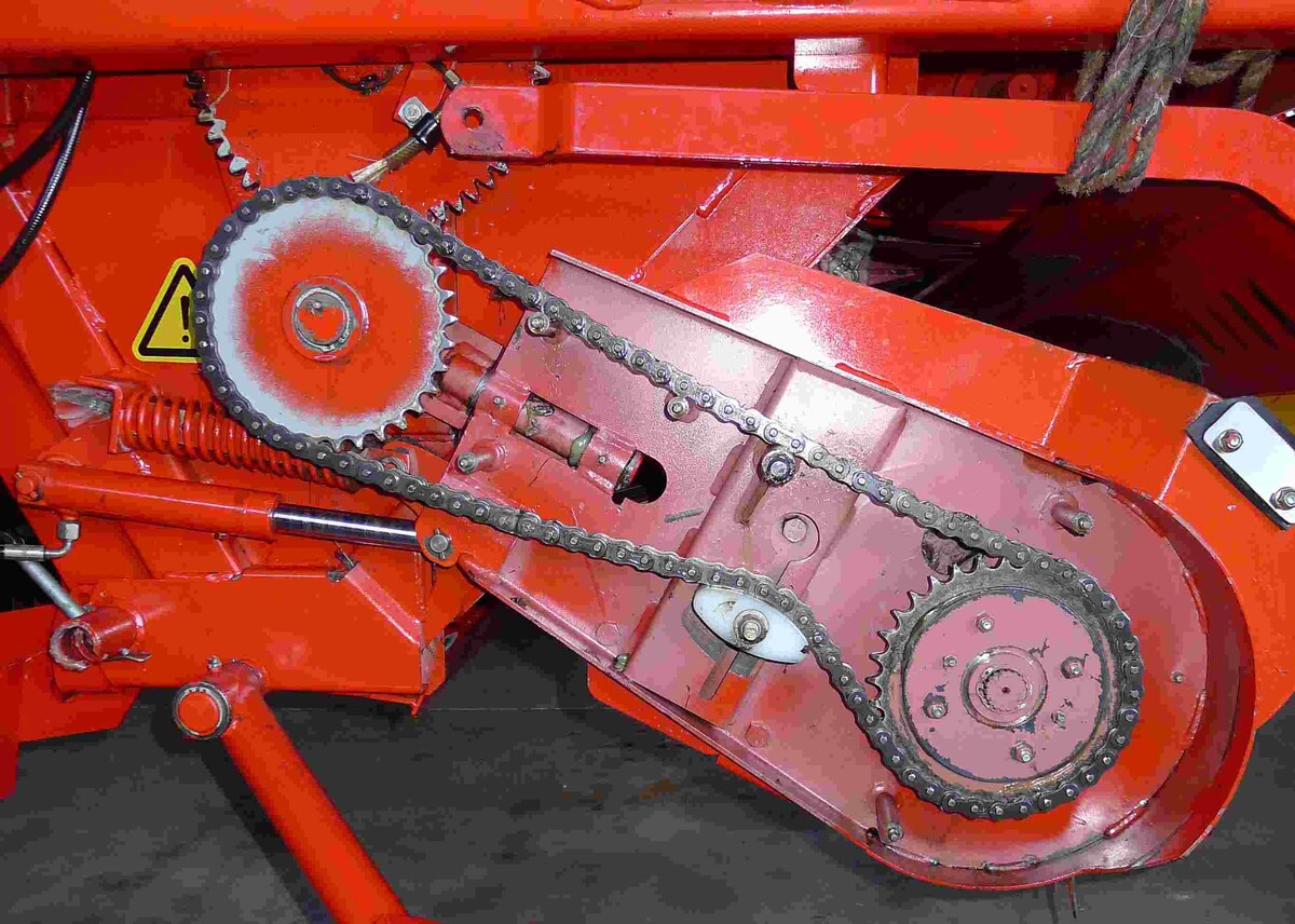 - Beim Kettenförderer ist die Kettenspannung zu kontrollieren. Beachten Sie dabei den Zustand der Stahl-Sicherungsstifte an den Ketten-Verbindungsgliedern.