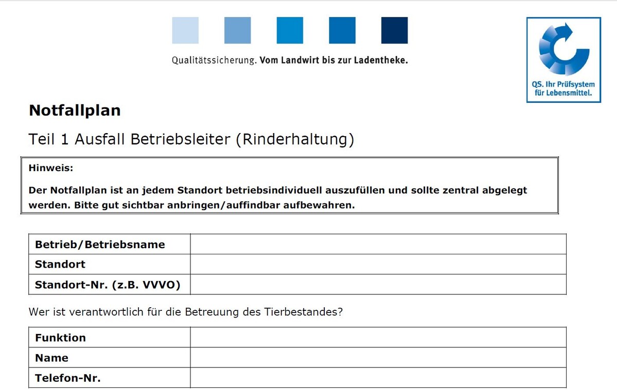Wenn großflächig der Strom ausfällt (wie im Thema der Woche in BWagrar-Ausgabe 16/2021 beschrieben), sollten Sie die wichtigsten Daten parat haben. Die QS Qualität und Sicherheit GmbH, Bonn, hat Muster-Vorlagen entwickelt, die Sie unter den folgenden Links finden. Am besten ausdrucken und ausfüllen.