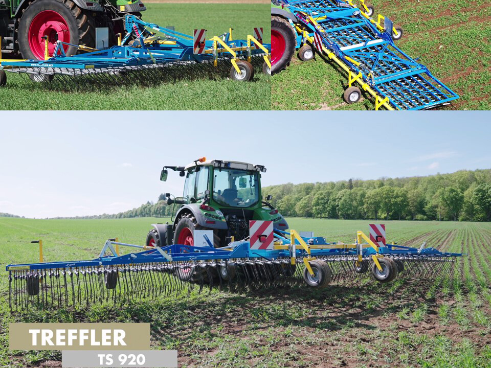 Der vorgestellte Striegel TS 920 von Treffler hat eine Arbeitsbreite von neun Metern und legt Wert auf eine filigrane Bauweise. Die Zinken können bis von unten bis oben in einem Winkel von 57 Grad bewegt werden. Das Material Hartmetall erlaubt ein besseres Eindringen in den Boden. 48 verschiedene Größen werden gebaut.