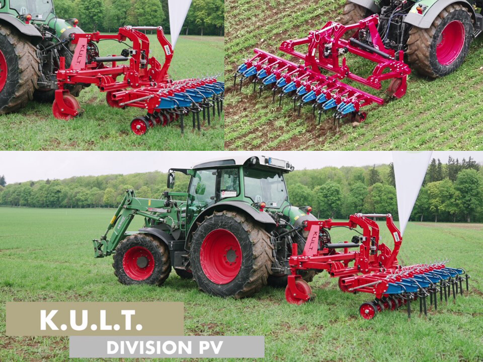 Die Hacksequenz startete mit dem Ivision PV von K.U.L.T. mit einem kamerageführten Reihenhacke mit Parallelverschiebung. Dazu seien auch alte Hackrahmen verwendbar. Hohe Präzision bei kleinem Gesicht lautet die Versprechung. Die Hacke besitzt eine Kamera, die über einen Verschieberahmen die Kamera steuert. Trifft ein Hackschar auf Steine im Boden, hebt es sich aus. Die Hacke eigne sich auch für den kleinstrukturierten Anbau. Es können zwei oder drei Einheiten am Hauptrahmen befestigt werden mit je einer Breite von drei Metern.