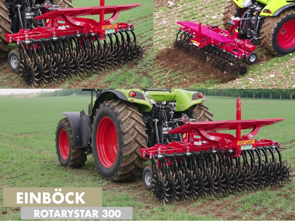 Bei der Rotorhacke Rotarystar 300 von Einböck sind alle Hacksterne separat aufgehängt. Sie sei überall einsetzbar mit einer Stärke in kleinem Unkraut und habe eine krustenbrechende Wirkung. Die hydraulische Nivellierung mit Druckausgleich erlaube eine Anpassung an Bodenunebenheiten. Mit 15 kmh ist sie sehr schnell unterwegs, bei vielen Bedingungen einsetzbar, beispielsweise auch beim Blindstriegeln oder in Maisbeständen.