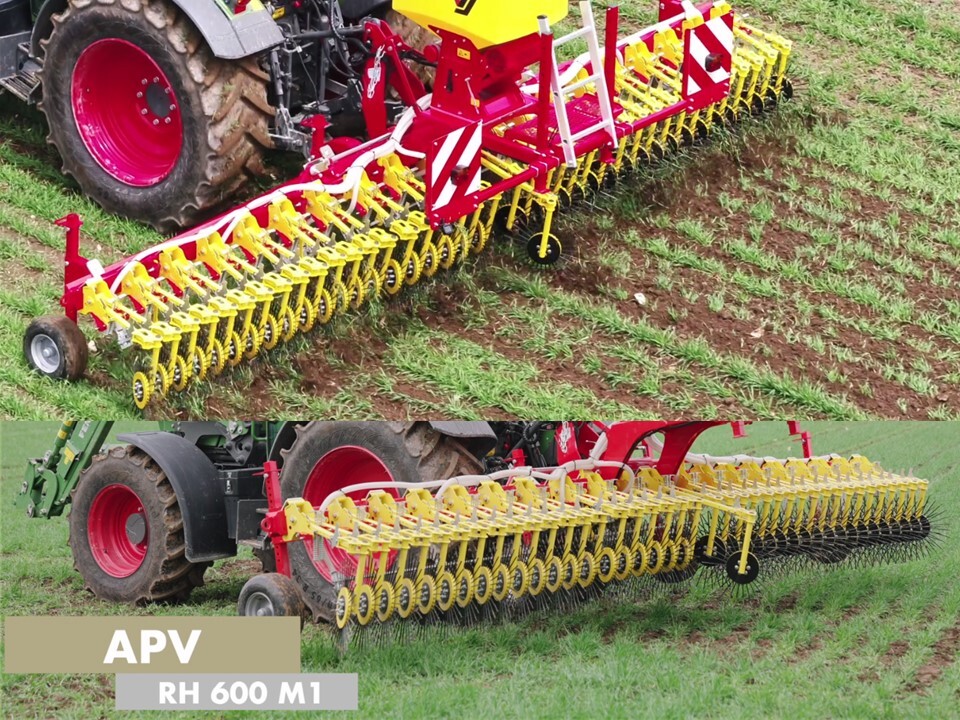 RH 600 M1 lautet die Bezeichnung einer Rollhacke von APV mit sechs Metern Arbeitsbreite, die auch mit einem pneumatischen Sägerät für Untersaaten ausgestattet werden kann. 40 rotierende Hackringe waren an der vorgestellten Version angebracht, die einzeln hochgehoben werden können und erlauben, das Gerät auch in einer Reihenkultur in sensiblem Stadium einzusetzen. Die Hackringe sind – als Besonderheit – von null bis 30 Grad verstellbar. Eine Fahrgeschwindigkeit von zwei bis zwölf Stundenkilometer ist möglich. Der Einsatz sei auch bei feuchtem Boden gut möglich.