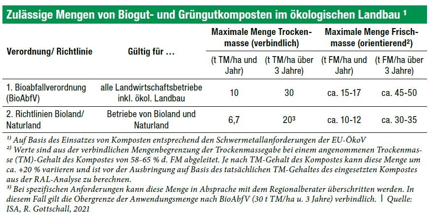 Die EU-Öko-Verordnung erlaubt es, kompostierte oder fermentierte, getrennt gesammelte organische Haushaltsabfälle beziehungsweise pflanzliche Materialien im Ökolandbau einzusetzen. Hier werden auch Grenzwerte für Schwermetallgehalte festgelegt. Selbstverständlich muss der Kompost zudem frei von Phytopathogenen sein.