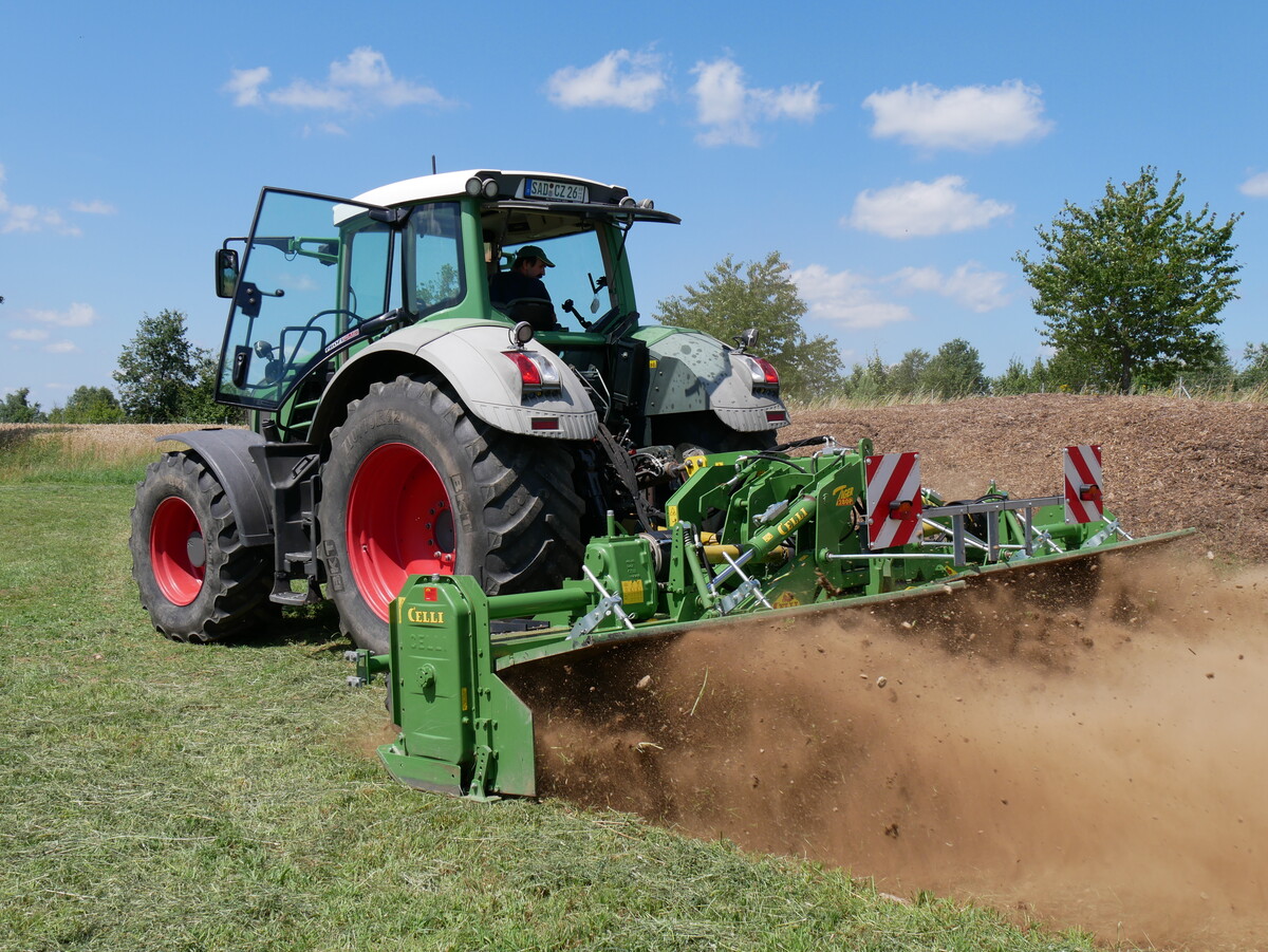 Seit 2014 bearbeitet Hägler seine Böden ohne Pflug: „Wir müssen die Bakterien im Boden erhalten; die, die Sauerstoff wollen, bleiben oben und die anderen unten.“ Um Kleegras, Untersaaten, wintergrüne Zwischenfrüchte und auch Maisstoppeln in Flächenrotte oder zur schnelleren Umsetzung zu bringen, setzt er eine „Hackfräse“ ein. Die Maschine habe eine andere Messerstellung als herkömmliche Bodenfräsen, erläutert der Lohnunternehmer. Er zeigt die Arbeit der Maschine an einem gemähten Luzerne-Grasbestand: Die Fräse schneidet den Boden in 3 bis 4 cm Tiefe ab und wirft das Material durch den offenen Deckel aus. Der Feinboden liegt dann unten, das organische Grobmaterial oben, wodurch es sicher absterben soll. „Damit das funktioniert, haben wir die Maschine weiterentwickelt“, sagt der Oberpfälzer. Für die modifizierte Fräse des italienischen Herstellers Celli hat er den Exklusivvertrieb in Deutschland.