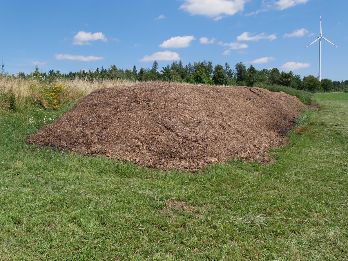 Heute hat Hägler keine Gülle mehr, dafür Mist, den er nach dem System von Walter Witte aufbereitet. Der Kalbinnenmist enthalte viel Stroh, damit er nicht zu nass sei. „Mit dem Miststreuer abstreuen, damit Luft reinkommt, und eine zwei Meter hohe Miete aufsetzen“, erklärt er. Das Ganze werde dann mit dem Radlader angedrückt, damit es außen verschlossen sei. Es stelle sich eine Temperatur von bis zu 55 °C ein: „Nährstoffe gehen so nicht verloren. Huminstoffe bilden sich. Die Miete wird nicht abgedeckt und auch nicht umgesetzt, damit das CO2 nicht in die Luft geht. Ich hab mit einem CO2-Messgerät schon über 20.000 ppm CO2 gemessen. Also: Das CO2 bleibt drin.“ Nach rund zwölf Wochen Reifezeit könne der aufbereitete Mist mit bis zu 10 t/ha*a ausgebracht werden. Er habe ein für das Pflanzenwachstum optimales C/N-Verhältnis von 16:1: „Das heißt, er wirkt schnell.“