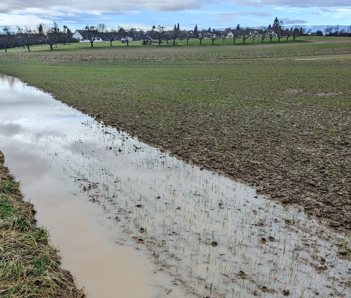 Durch die anhaltenden Niederschläge der letzten Wochen ist auf vielen Flächen eine anhaltende Wassersättigung zu beobachten. Der noch im Boden vorhandene Sauerstoff wird durch aerobe Mikroorganismen sowie Pflanzenwurzeln wesentlich schneller verbraucht als neuer nachgeliefert werden kann, sodass bereits nach einem Tag Staunässe völlig sauerstofffreie Zonen im Boden entstehen. Sind die überfluteten Flächen bereits mit Wintergetreide bestellt, führt der Sauerstoffmangel an den Wurzeln je nach Umgebungstemperatur nach 2-4 Tagen zu deutlichen, teilweise irreversiblen Wachstumsdepressionen der Pflanzen. Stehen die Böden länger als 10 Tage unter Wasser, kann dies zu Ertragseinbußen zwischen 20 und 50 Prozent führen, da die Spitzen der vorhandenen Wurzeln absterben, sich an diesen aber auch nach der Entwässerung keine neuen Seitenwurzeln bilden. Allerdings gibt es hier zum Teil deutliche Sortenunterschiede, da Sorten mit erhöhter Fähigkeit zur Bildung von Adventivwurzeln am ersten Knoten Staunässe deutlich besser überstehen.